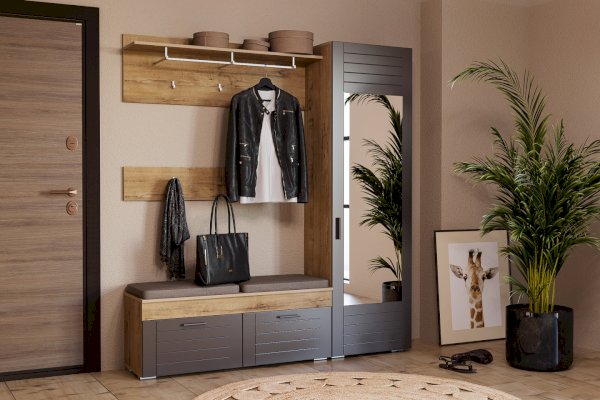 Выдвижная штанга предназначена для размещения одежды на вешалках-плечиках и помогает быстро найти нужную вещь. В шкафу также находятся и две широкие полки. Антресольная полка лучше всего подходит для хранения сезонной одежды, а нижняя – для размещения коробок с обувью.