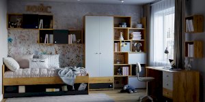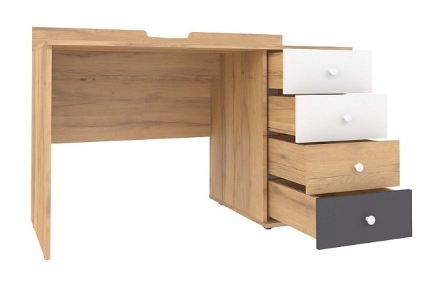 Стол письменный отличается нестандартным решением для столешницы, которая максимально адаптирована для потребностей современных детей и работе на компьютере. Под откидной её частью, которая открывается за плавный вырез, прячется ниша для хранения и отверстие с заглушкой для вывода проводов, чтобы они не запутывались и не мешали ребенку. Если ребенок ещё не занимается за компьютером, то нишу можно использовать и для размещения органайзеров с карандашами, фломастерами и красками, чтобы они не отвлекали от творчества. Дополняют стол ящики на шариковых направляющих. За счет просторной рабочей поверхности, а также возможности левосторонней и правосторонней сборки письменный стол одинаково удобен как для левши, так и для правши.