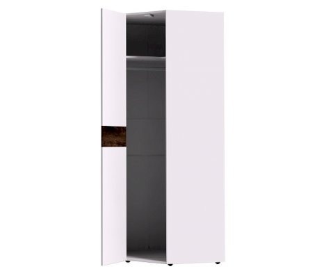 Шкаф угловой Норвуд 156 оснащен стационарной штангой, полочками для белья и беспроводным светодиодным светильником, который включается при открывании двери. Это особенно удобно, если нужно найти в шкафу вещи, не потревожив близких. Легкая установка на магнитное крепление - не требует сверления, прокладывания провода, подключения к сети. Глухой белый фасад с декоративной вставкой в цвете Орех Шоколадный открывается за ручку из массива. Фасад шкафа возможно навесить как на правую, так и на левую сторону.