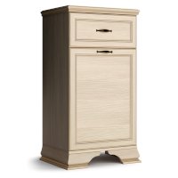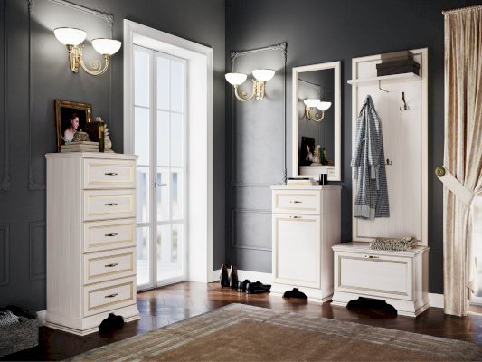 Мебель выпускается в классическом стиле с применением декоративных элементов в виде профиля, фигурных опор и золотого патинирования. В основе изделия высококачественное ЛДСП теплого оттенка «бодега белый», имеющего древесную текстуру. Лицевая фурнитура цвета «старая бронза» смотрится очень изысканно на фасадах изделия.
