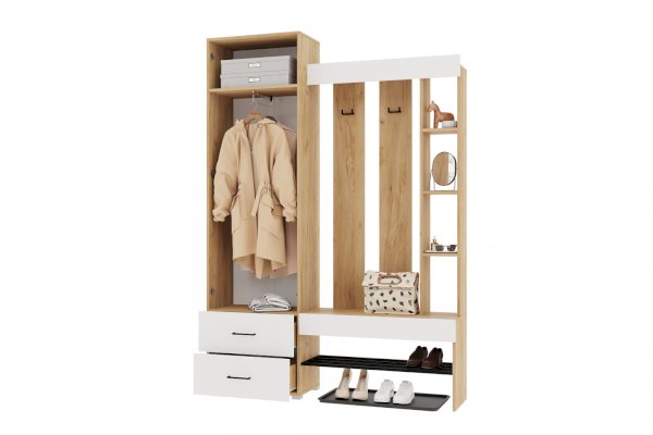 Шкаф оборудован выдвижной штангой и полкой, предусмотрены ящики для хранения.