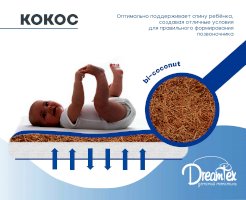 Идеально подходит для большой трансформации кроватки Dreams Smart. Двухслойный матрас позволяет регулировать жесткость спального места для вашего малыша, а натуральные материалы (кокос) создадут оптимальный ортопедический эффект от эксплуатации. Кокосовая койра – качественный, натуральный, износостойкий материал, используемый в матрасном производстве в качестве жесткого наполнителя.