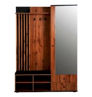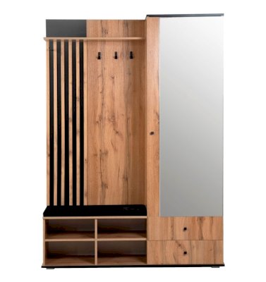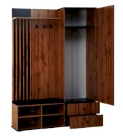 В шкафу есть открытая секция с тремя металлическими крючками, чтобы повесить верхнюю одежду. Ниже предусмотрен мягкий элемент, чтобы можно было присесть и снять обувь или просто поставить сумку. В закрытой секции - выдвижная штанга и шляпная полка. Выдвижная штанга выдерживает вес до 16 кг. Снизу предусмотрены два вместительных выдвижных ящика с шариковыми направляющими. Ящики можно использовать для хранения обуви и обувных аксессуаров.